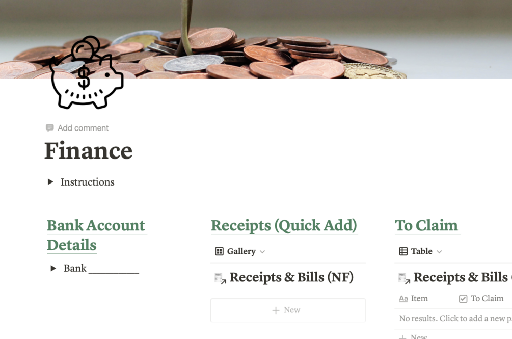 Finance - A simple set up that can store all areas of Finance. This is a great starter template that covers Bank details, tracks receipts, bills, claims. Includes Budget, tasks and Filing Cabinet.