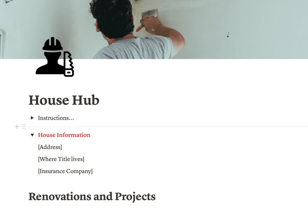 House - Includes a House Information section and a large House Renovation template that allows you to manage projects, keep a timeline, shop for goods, keep a budget, make tasks, track tradesmen, and store resources.